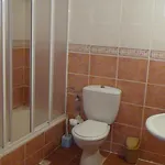 Inredningen inkluderar soffa samt TV. I badrummet finns även ett badkar och en dusch.